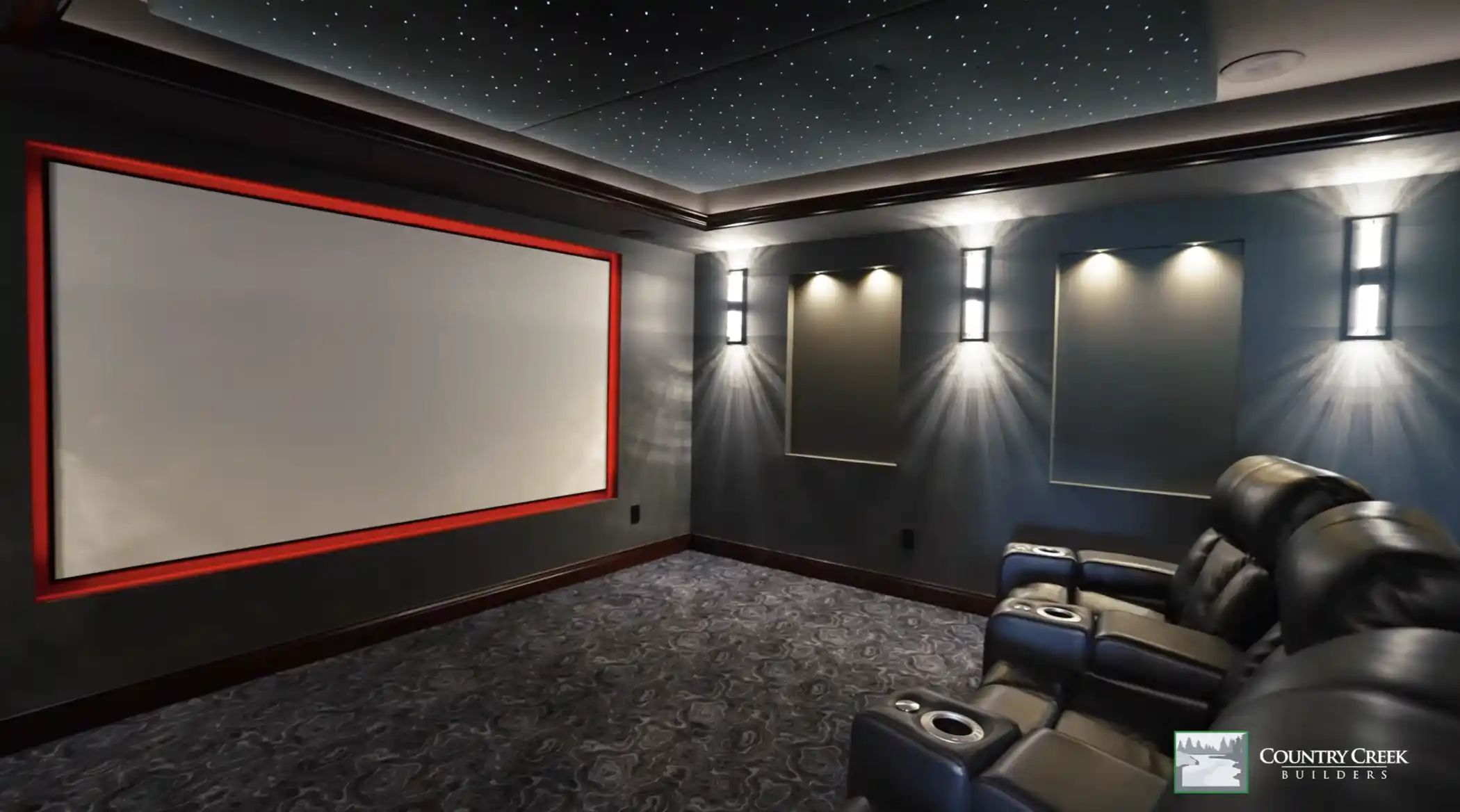 Country Creek Builders finished this Shakopee basement remodel project and put together a video walkthrough of the whole thing — theater room with a star ceiling and 102-inch projection screen, workout room, tiled shower, the works. It's really good work.