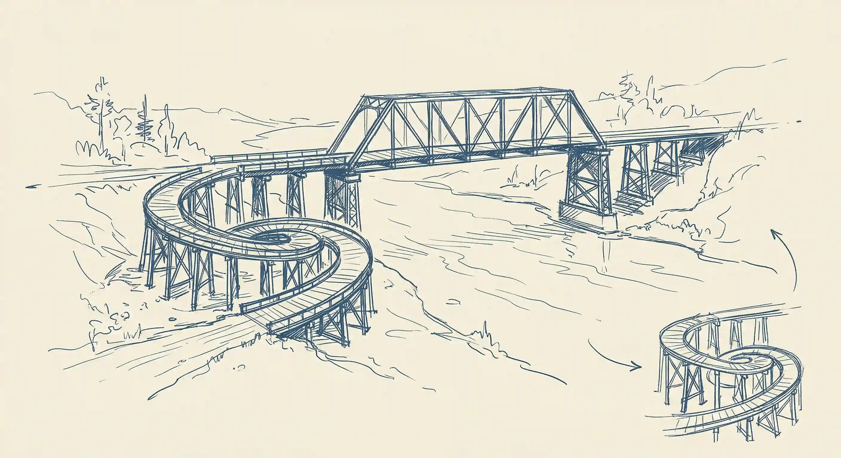 The Wisconsin Bridge and Iron Works of Milwaukee built it in seven months for $39,050. A Baltimore truss with a curved top chord, nearly 2,000 feet long, with the spiral approach tacked onto the south end like an afterthought—except it was the whole point.