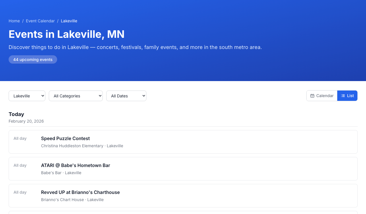 The calendar will let you filter by city and category, so whether you're looking for live music in Lakeville or a family event in Eagan, you'll find it in one spot. Or just open it up to the entire south metro and see everything that's happening across the area.